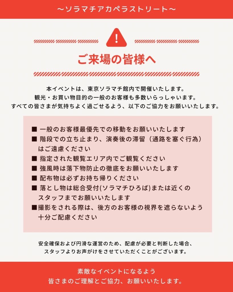 【ご来場の皆様へお願い】 当日の注意事項を画像に記載しています。 ご来場前に一度ご確認ください! ご理解・ご協力よろしくお願いします詳細はこちらもご確認ください。☟ご来場の皆さまへ | ソラマチアカペラストリート2025